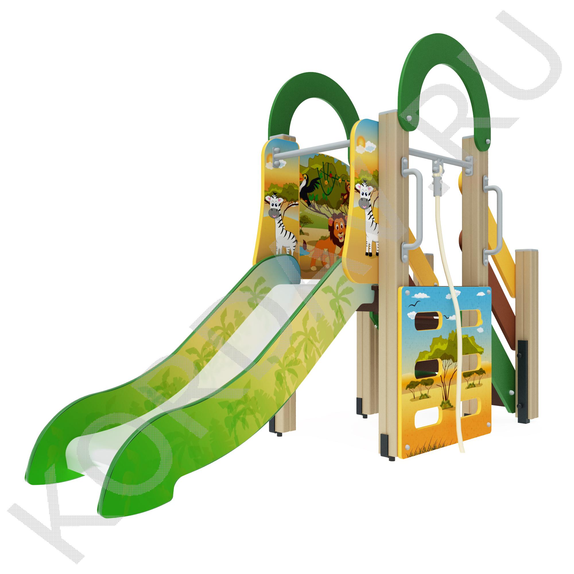 Конструкция детской горки предусматривает наличие башни, которая держится на четырех клееных брусьях размерами 9х9 см. Пол башни изготовлен из фанеры с антискользящим покрытием. Над башней предусмотрено наличие арок размерами 780х500 мм. Для поднятия на горку предусмотрена лестница из двух ступенек. Она имеет несколько перил и борта. Кроме того, предусмотрено наличие щита-ограждения с отверстием, его размеры составляют 780х700 мм. Также у детской горки есть канат, сделанный из полиуретана.