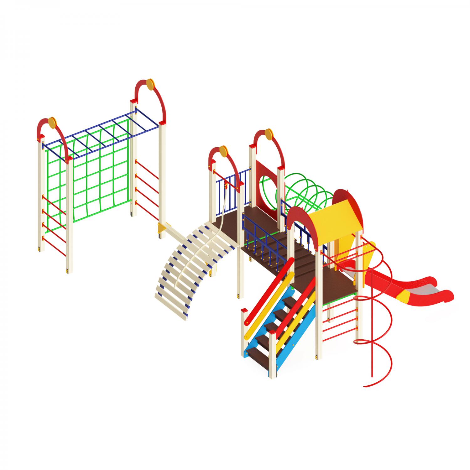В комплектацию входит: Башня 2шт, горка, подвесной мост, лестница, вертикальный шест со спиралью, рукоход, решетка для лазания, бум, канат, лаз труба наклонная, лаз дуга.