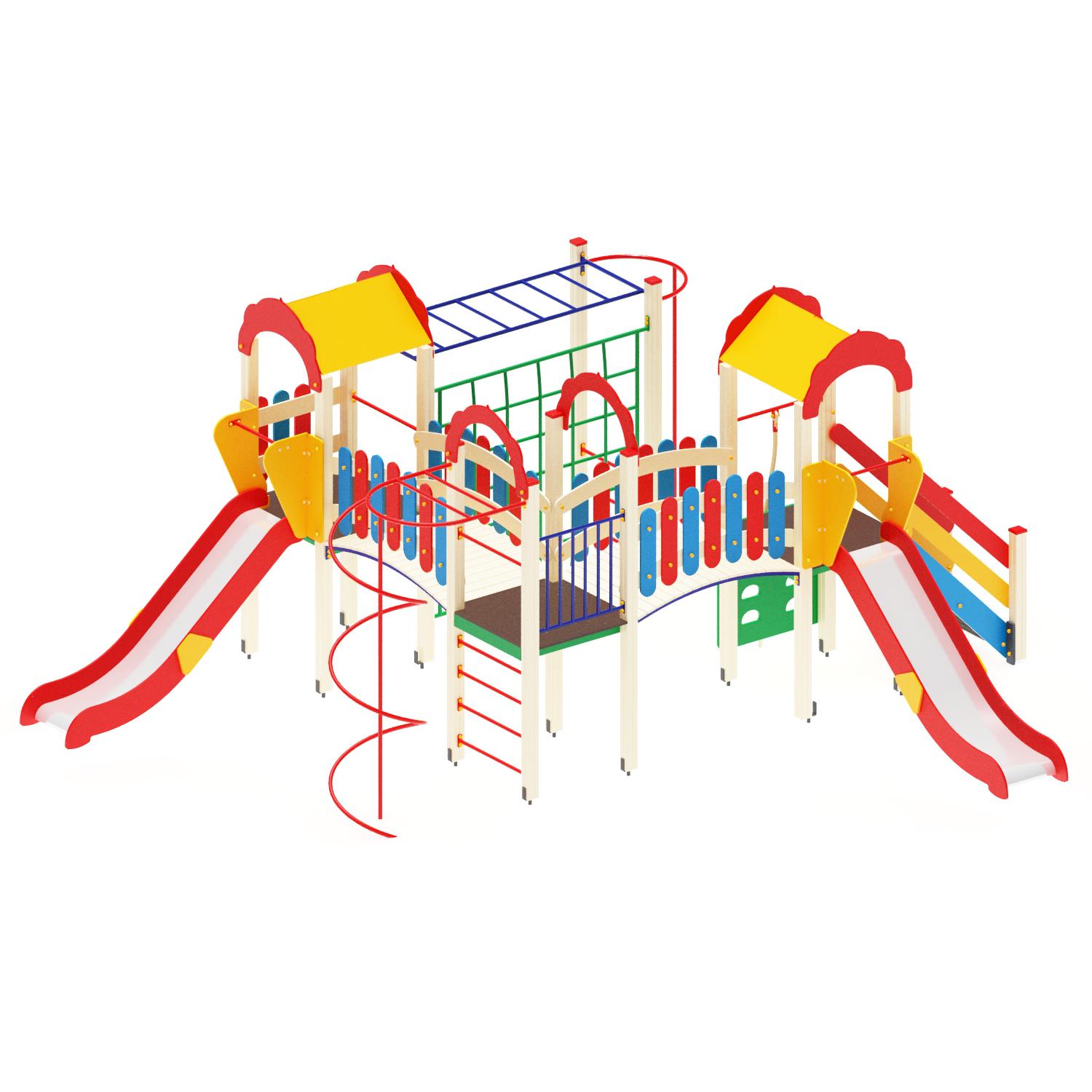 - Конструкция: три башни, каждая из четырех клееных брусьев 100х100 мм, высота 2500 мм.
