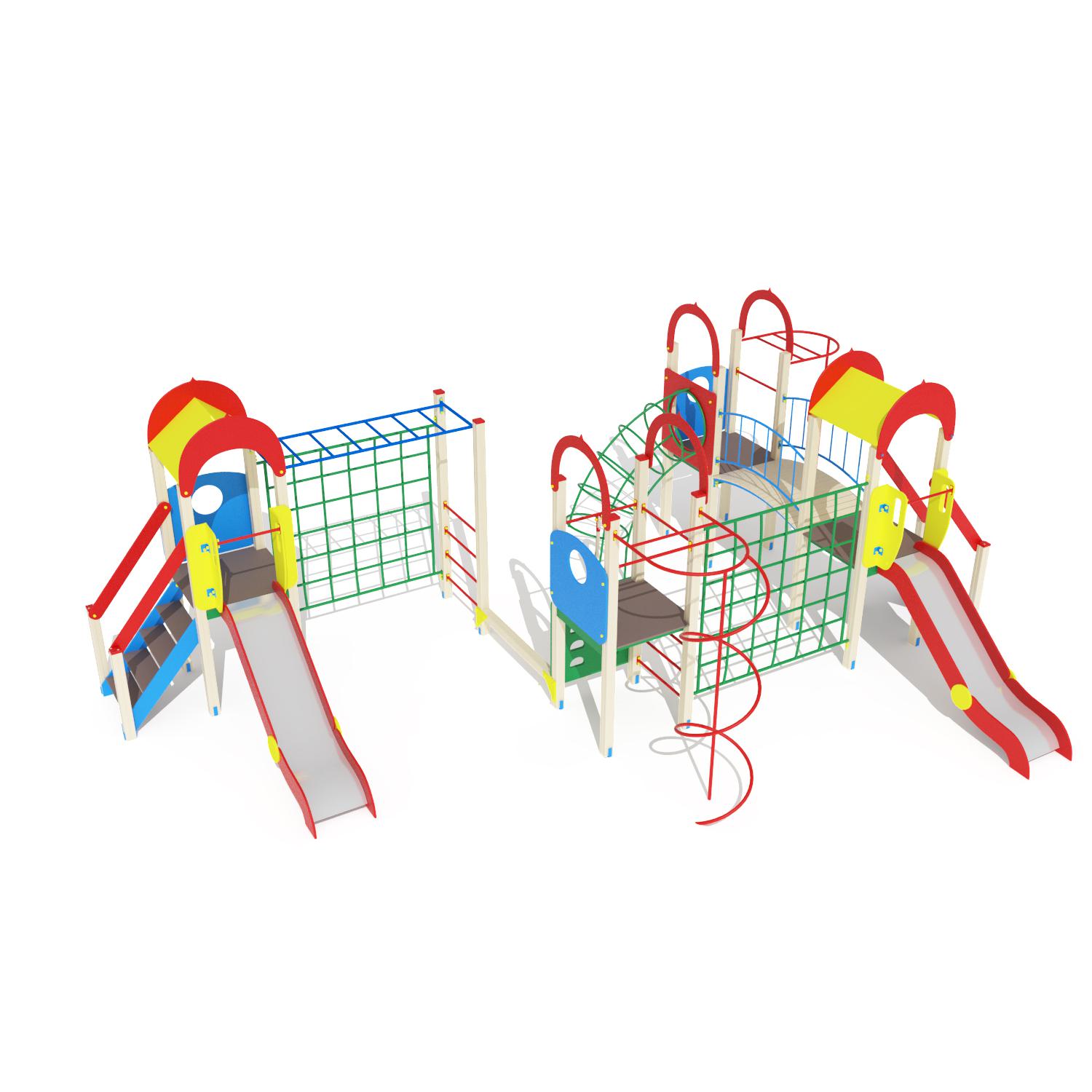 Многофункциональный комплекс содержит: Две горки, три мишени для игры с мячом, канат, бревно, рукоход, спираль, альпинистскую стенку, кольцевой спуск, мостик, две гимнастические сетки.