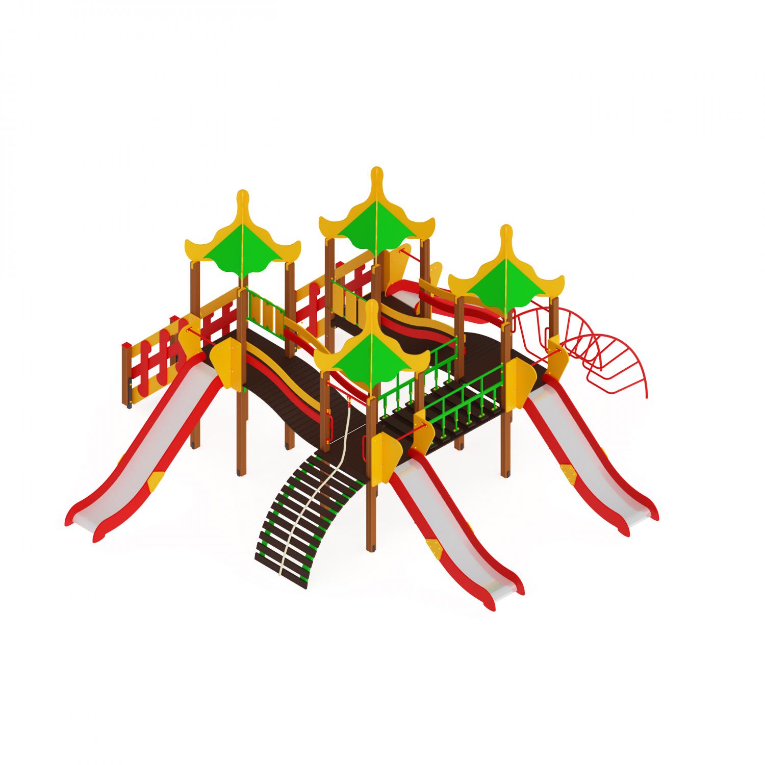 Комплекс игровой состоит из: 4 башни с арками и четырехскатной крышей, две лестницы с перилами, 2 бум-моста, 2 низких скат-горки и 2 высоких, 1 бум с канатом, 1 лаз из труб.